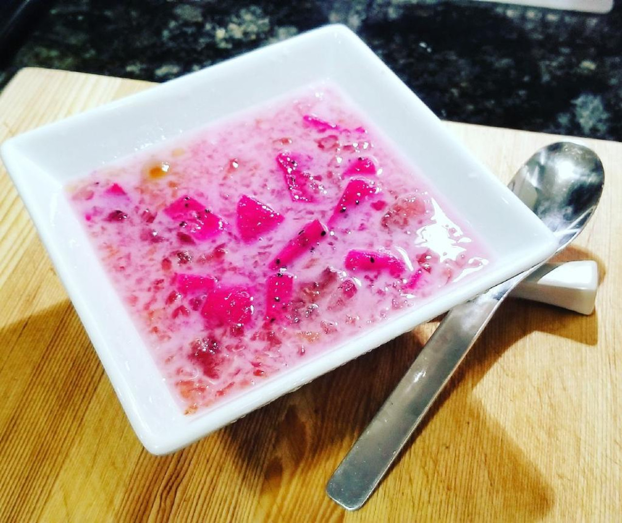4.待桃胶冷却后,放入切好的火龙果,也可按个人口味加入牛奶或椰子奶。即可食用。
